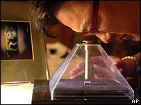 His biggest work to date is his 2003 picture of the Titanic, on a 2mm-long mineral sliver. One of his works is inscribed with the words: "I have loved the sun all my life and always wanted to paint the sun" in letters a fraction of a millimetre wide, painted using a sharpened human hair. And in 2002, Micro-artist Willard Wigan spent months designing, sculpting and painting a miniature figure of Muhammad Ali fighting Sonny Liston on a pin head. His collection includes a Snow White and the Seven Dwarfs, Tower Bridge and Jesus - each fitted into the eye of a needle. It also features a minute Statue of Liberty and a boxing ring containing Lennox Lewis and Evander Holyfield. |